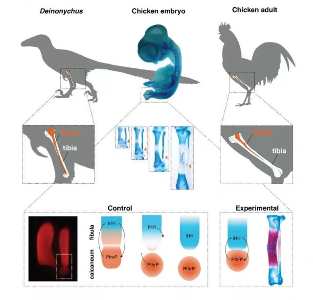 恐龍的腓骨(fibula,橙色部分)會延長至膝關(guān)節(jié)踝處,而雞的腓骨則比恐龍的小得多,經(jīng)過改造雞的胚胎中也顯現(xiàn)了腓骨的邊長
